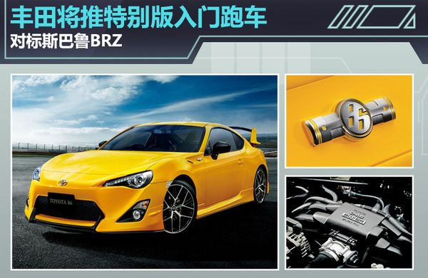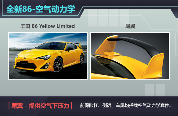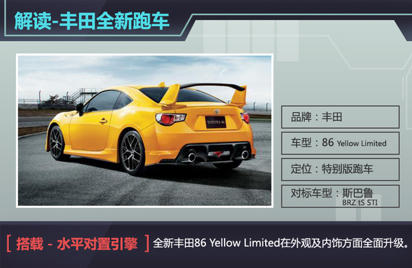当代丰田旗下的入门级跑车当属86最为人们知晓,其良好的综合性能继承了丰田与富士重工的多项经典技术与科研成果,承袭了日本传奇跑车AE86的操控特性后,新车在推出之日起便得到了较高人气,而以该车为原型的衍生版跑车也即将问世。日前网通社从车迷世界Worldcarfans获悉,丰田将基于标准版86打造一款高性能跑车86 Yellow Limited,新车将延用标准版车型所搭载的水平对置引擎,并且针对其底盘、车架及空气动力学套件做出强化升级,并与斯巴鲁BRZ tS STI一同竞争在高操控性能跑车阵营之中。