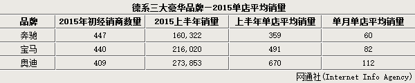 2015上半年中国乘用车市场销量增速逐渐放缓,行业增长率仅为4.80%,回落6.38个百分点。受此影响,多家豪华品牌在华销量增速也出现不同程度的下滑,并有少数车企出现负增长。经销商的效益直接关系着豪华品牌的业绩。网通社在对德系三大豪华奔驰、宝马和奥迪品牌的销量和经销商进行统计梳理后发现,这三家国内市场份额占比最大的豪华品牌中,奥迪2015上半年在华单店平均销量超过奔驰、宝马近1倍,奥迪经销商个体收益也优于奔驰和宝马。