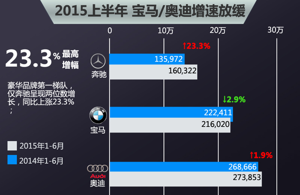 在销量方面,根据奔驰、宝马、奥迪三家车企公布的上半年在华业绩,除奔驰实现两位数同比增长外,奥迪和宝马增长率均出现下滑,其中宝马更是出现负增长。据统计,奔驰(不含smart)上半年销量同比增长23.3%达到160,322辆,在华连续28个月稳固增长。宝马品牌上半年在华销量出现微跌,同比下滑2.9%至216,020辆。奥迪在华上半年销量增速放缓,销量为273,853辆,同比仅增长1.9%,但仍是国内豪华品牌的销量冠军。
