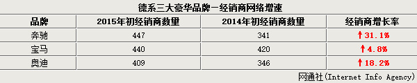 近年来德系三强在华的经销商网络均开始全面拓展,奔驰在2015年初已成为在华经销商数量最庞大的豪华品牌,总计达到447家,同比增长率高达31.1%。而宝马、奥迪的建店速度逐年放缓,增长率分别为4.8%和18.2%,经销商数量亦达到440家和409家。