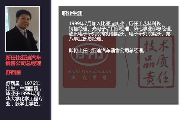 对于外界来说,舒酉星这个名字并不被很多人所熟知,甚至连他的个人清晰照片都难以寻觅。通过我们对其过往的职业履历进行梳理后发现:舒酉星其实和侯雁有着十分相似的职业轨迹,两个人均是从大学直接进入到比亚迪汽车公司,并一直在公司任职至今。