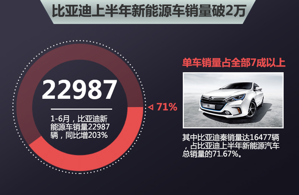 数据显示,今年1-6月,比亚迪累计销售新能源汽车22,987辆,同比增长203.8%。其中,比亚迪秦依然是贡献最大的产品,单一车型销量便超过了16,477辆,占比亚迪新能源车总销量的71.67%。从上述几组数据中看,比亚迪汽车市场表现良好,但若算上传统燃油动力车的销量,比亚迪汽车并没有取得预期的成绩。