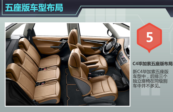此次上市的C4毕加索分为5座版与7座版车型,其中五座版车型在后排采用了三个独立座椅的设计,与传统的轿车非常不同,在其他车型中并不多见。此外值得一提的是,每一把椅子都可以调节前后位置和靠背角度,不论大人还是小孩子,乘坐起来都非常舒适。