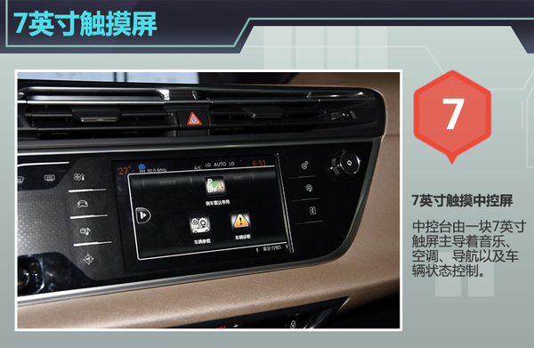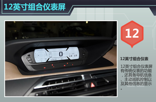 进入新车的内部空间,首先映入眼帘的是尺寸分别为12英寸和7英寸的两块中控显示屏。其中位于中控台顶部的12英寸大显示屏具有兼具传统仪表的功能,除了显示各项行驶信息,还具备导航信息、主动巡航控制以及其他信息的显示,这在其他车型上是不多见的,可以成为雪铁龙品牌的重要特征之一。(网通社2015年7月16日北京报道)