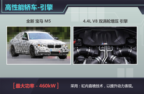 宝马全新一代M5在引擎舱内搭载了一台4.4L V8双涡轮增压引擎,得益于缸内直喷技术的应用,当引擎处于标准大气压及正常温度时,这款全新引擎能够爆发出460kW的最大输出功率。在选装xDrive系统后,新车将展现出更强的综合性能。