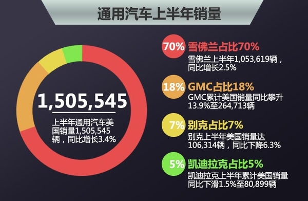 通用旗下品牌雪佛兰上半年1,053,619辆,同比增长2.5%;别克上半年美国销量达106,314辆,同比下降6.3%;今年上半年,GMC累计美国销量同比攀升13.9%至264,713辆;凯迪拉克上半年累计美国销量同比下滑1.5%至80,899辆。