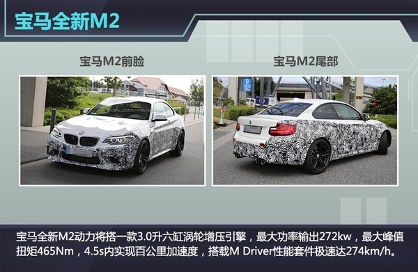 全新宝马M2连日以来谍照频频曝光,动力有望搭载一款3.0升六缸涡轮增压引擎,最大功率输出272kw,最大峰值扭矩465Nm,标配后驱,传动装置提供6速手动或7速DCT变速箱供选配,4.5s内实现百公里加速度,搭载M Driver性能套件极速达274km/h。