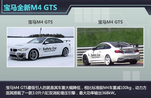 至于宝马M4 GTS最吸引人的就是其车重大幅降低,相比标准版M4车重减100kg,不设有后排座椅,不过提供防滚架供选配,动力方面其搭载了一款3.0升六缸双涡轮增压引擎,最大功率输出368kW,全新宝马M4 GTS将限量供应。