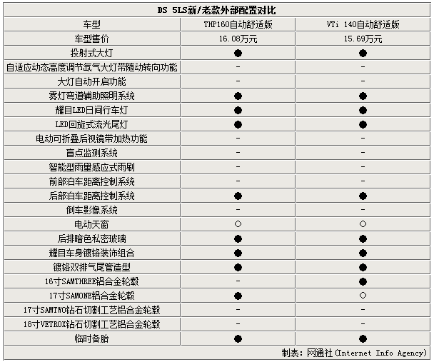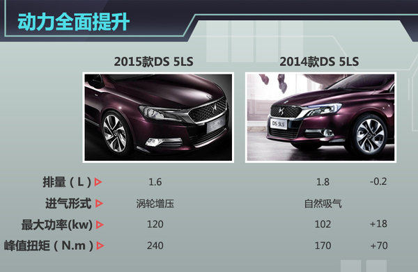 通过上述对比我们可以看出,DS 5LS的THP160自动舒适版车型相比老款车型而言,在更换了1.6THP发动机后动力得到全面提升,同时车辆油耗也是相应的有所提升,但是相比自然吸气发动机并无太多变化,加上车辆标配了17寸铝合金轮毂,因此增加3,900元的价格还是相当实在的。(网通社2015年7月20日北京报道)