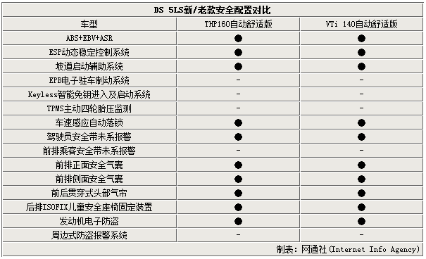 DS 5LS本次推出的新款车型中,原先三款搭载1.8L自然吸气发动机的车型(标示为VTI140),分别更换为搭载1.6THP发动机的THP基础版、舒适版与雅致版,手动版车型也得到取消,变为全系配备6速自动变速箱。这其中THP160风尚版与VTI140雅致版在配置上有所区别,而THP160舒适版与原先的VTi140自动舒适版配置基本相同,在更换了发动机后价格上涨接近4,000元,配置上也有变化。