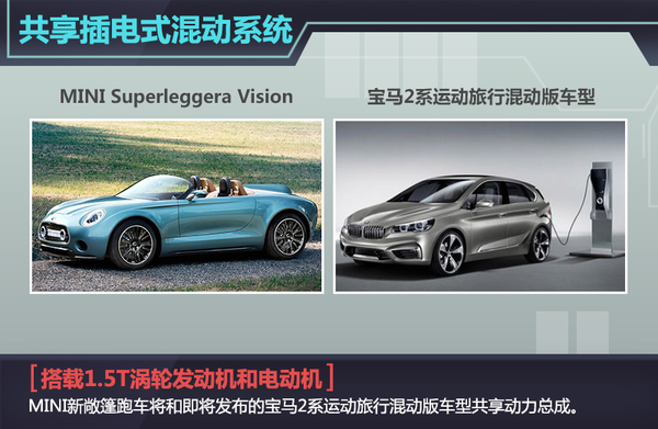 MINI Superleggera Vision将采用和即将发布的宝马2系Active Tourer插电式混动车相同的混动系统。搭载一款最大功率和峰值扭矩分别为100kW和220 Nm的1.5升TwinPower涡轮增压发动机,并匹配一台电动机,其最大功率和峰值扭矩分别为65kW和165 Nm。根据宝马2系混动版2.5L的综合油耗来看,混动的Superleggera在油耗表现上预计和其相近,达到比较优秀的水平。