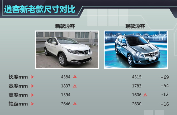 在车身尺寸方面,东风日产全新一代逍客(两种不同排量车型数据不一,图中选取的是1.6L和2.0L的部分车型)长、宽、高分别为4384mm、1837mm、1594mm,轴距为2646mm,除高度有所降低外,长度、宽度、轴距数值都有所加大,更加偏向跨界风格。值得一提的是,老款奇骏与现款逍客轴距长度均为2630mm,两车定位分别是城市SUV和越野型SUV,全新一代奇骏轴距加长至2706mm之后,更加偏向城市SUV风格,全新一代逍客定位稍低。