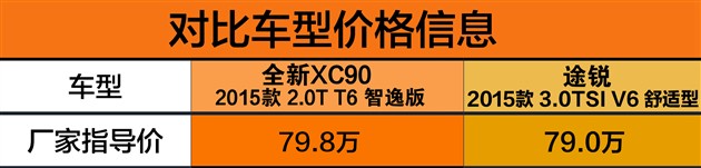 | 车型 | XC90 2.0T T6 智逸版 | 途锐 3.0TSI V6 舒适版 |