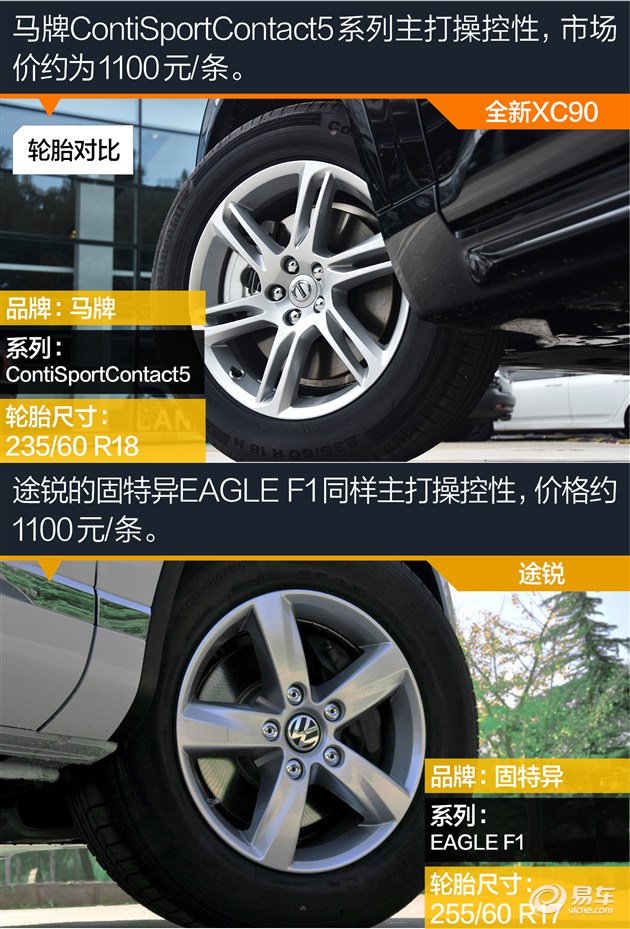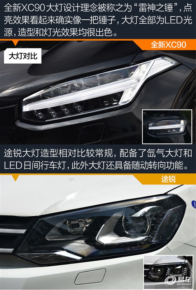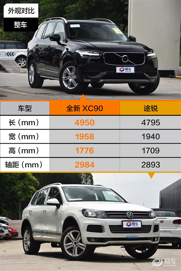 全新XC90的长、宽、高和轴距均大于途锐,视觉效果上,更为方正的XC90如果说像肌肉猛男的话,途锐则更像魁梧的摔跤选手。