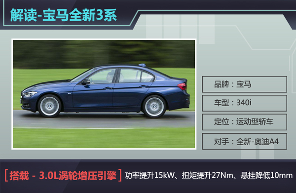 由于运动型轿车市场的竞争日趋激烈,因此德国豪华车品牌宝马已经意识到其现有的产品线并不足以对抗奔驰、奥迪等品牌,进而在推出3系轿车后,将在其衍生版车型的推出上再度发力。日前网通社从英国媒体AutoCar获悉,宝马将推出全新3系轿车。新车在动力单元中将搭载一台排量为3.0L的涡轮增压引擎,作为接替现款335i的车型,这款全新3系轿车不仅在动力方面有所提升,还正式更名为340i。