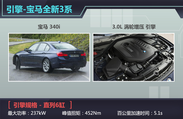 宝马全新340i在引擎舱内搭载了一台排量为2998cc的涡轮增压引擎,虽然该引擎为单涡轮增压结构,但依靠双涡管的设计,能够比拟双涡轮增压引擎的出力特性,当引擎转速达到5500-6500rpm时可产生237kW的最大功率。并且当转速维持在1380-5000rpm时能够爆发出452Nm的峰值扭矩。在8速自动变速箱的传动下,能够助其在5.1s内完成百公里加速,从而使极速突破260km/h。