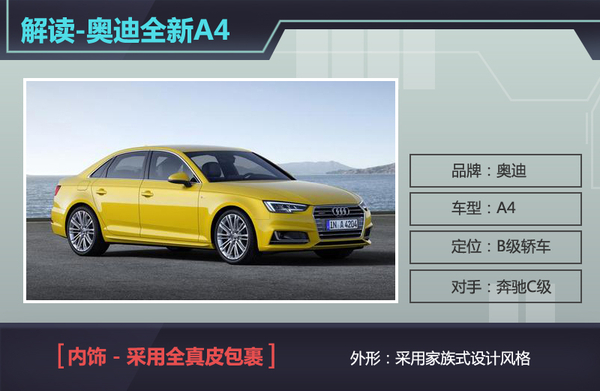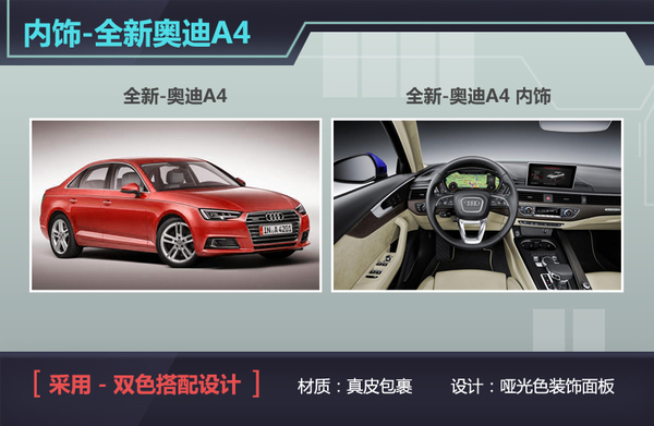 全新奥迪A4在外观方面延用了家族式的设计风格,盾形中网两侧采用了全新设计的LED光源头灯组。但作为一款以豪华舒适为趋向的轿车,全新奥迪A4则将重点投向了内饰设计方向,从而在保证豪华感的同时,提升驾乘人员的舒适性需求,从而向奔驰C级发起挑战。