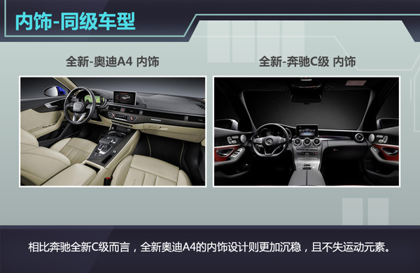 同为豪华趋向的奔驰C级,在舒适性设计方面具有较高造诣。但相比之下,全新奔驰C级的内饰则更倾向于运动化设计,而全新奥迪A4则巧妙的将黑色真皮与不同质地的装饰面板相结合,在强烈反差且不失和谐的搭配下,体现出了沉稳大气的运动元素。