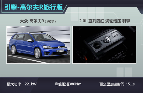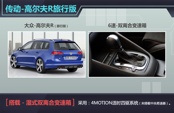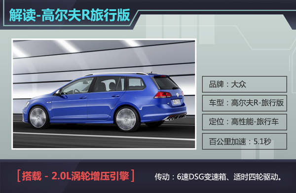 大众全新一代高尔夫R旅行版在配备上进行了全面升级,除搭载全新升级的双离合变速箱及手动变速箱外,还搭载了电子干预式的限滑差速器,使这款前驱小钢炮具有更强的操控特性,以便于在紧凑型高性能车中占据有利地位,而旅行版车架的设计在保证充足的动力基础上,使其使用性得到了革命性的提升。