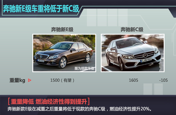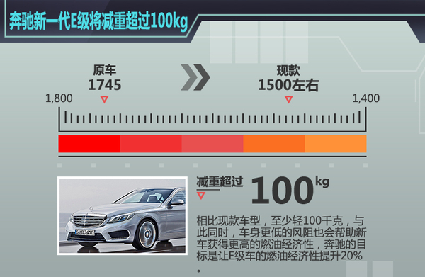 新一代E级将基于奔驰全新的MRA后驱模块化平台,其将以轻量化理念打造,新车将采用大量高强度钢材以及铝合金材料,个别车型重量将只有1,500千克左右,仅仅相当于部分A级车的重量。相比现款车型,新一代E级则至少会减轻100千克。值得注意的是,定位于豪华中型轿车市场的奔驰现款C级重量为1605kg,全新一代E级有望在重量上低于现款C级。与此同时,奔驰的目标是让E级车的燃油经济性提升20%,而车身更低的风阻系数也会帮助新车获得更高的燃油经济性。