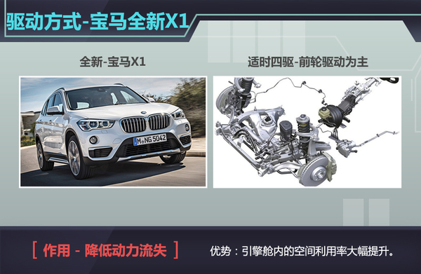 宝马全新X1最大的变化莫过于驱动方式的改变,由于全新宝马X1采用了UKL前驱平台,因此在布局方面省略了传动轴等部件,不仅降低了车重,还提升了动力推重比,最终避免了动力流失。而横置引擎也可最大程度降低引擎本体在机舱内所侵占的空间,从而能够将引擎舱的空间进行压缩,以保证充足的车内空间。值得一提的是:由于全新X1的引擎为横向放置,且采用前轮驱动,因此变速箱也将从更为接近驾驶舱的位置挪移到引擎下方,从而进一步提升前排驾乘人员的腿部空间。