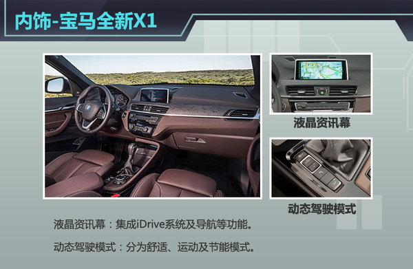 此外,全新宝马X1还将倒车影像、卫星导航等多项主动安全配置整合在全新升级的iDrive系统内,并在固定于中控台上方的液晶资讯幕中显示,以便驾驶者时刻掌握车辆的行驶状态。而棕红色的内饰色调在真皮质地的衬托下,凸显运动特质,同时又不乏稳重性格。