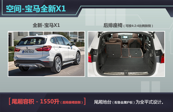 由于全新宝马X1的后排座椅能够按4:2:4的比例进行放倒,因此其尾厢储物空间最大可达1550升。得益于全平式的地台设计,驾乘人员在收放行李时则相对便捷,而铝合金尾厢护板则有效避免放取行李时对地台所造成的损坏。