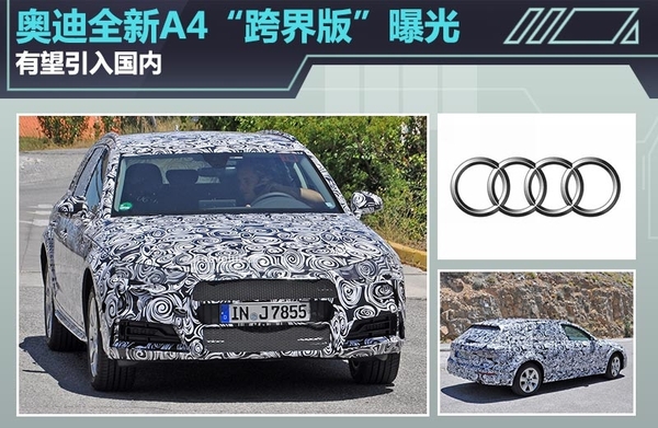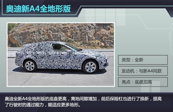 2015年上半年汽车市场并不景气,但奥迪作为德系三强之一,凭借着良好的口碑和过硬的技术依旧保持高速增长,上半年全球销量达到902,400辆,同比增长了3.8%,并在不久之前公布了最新一代A4的官图,让车迷们提前领略了这款奥迪经典车型的风采。日前,网通社从海外媒体Autoevolution获悉,奥迪将推出全新A4全地形车,新车与全新A4搭载同款引擎,底盘加高,通过性增强,目前正在进行路试,且路试谍照首次曝光。