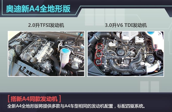 动力方面,全新A4全地形版将提供多款与A4车型相同的发动机配置,包括一款2.0升TFSI发动机,最大功率功率输出142kW,峰值扭矩320Nm;一款3.0升V6 TDI发动机,最大功率输出203kW,峰值扭矩600Nm。新车标配四驱系统,变速箱配置与A4轿车版相同。