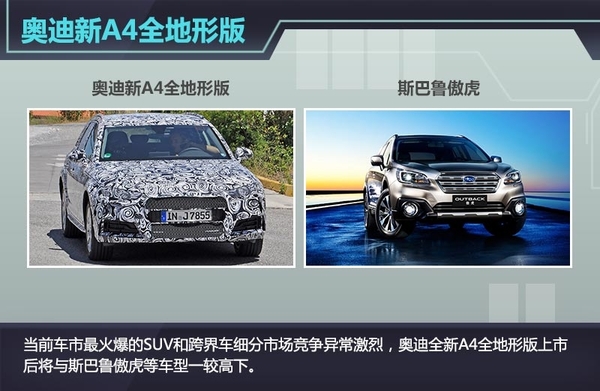 当前车市最火爆的当属SUV和跨界车细分市场,各大车企均加大了全新或改款跨界车型的研发力度并加快了研发进度,竞争异常激烈。奥迪全新A4全地形版上市后将竞争斯巴鲁傲虎和沃尔沃XC70等车型,相信其凭借出色的性能应该能获得不小优势。