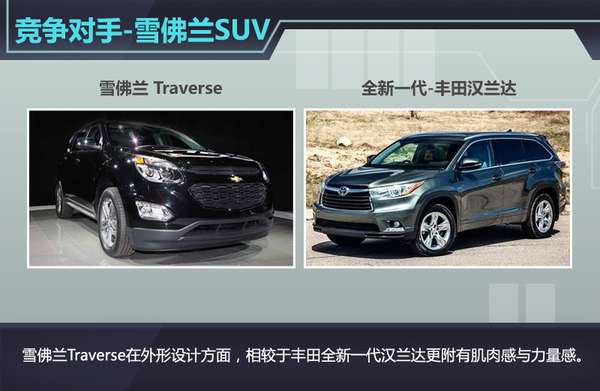 在中型SUV阵营中,来自于丰田旗下的汉兰达无疑是雪佛兰全新Traverse的宿敌。而在两车的对比中,虽然全新一代汉兰达采用了更为硬朗的设计风格,但雪佛兰Traverse则凭借更附力量感的肌肉车外观,以及更加圆润的线条勾勒,在实用性等优势下,将于2016年问世后与丰田全新一代汉兰达共同瓜分中型SUV市场。