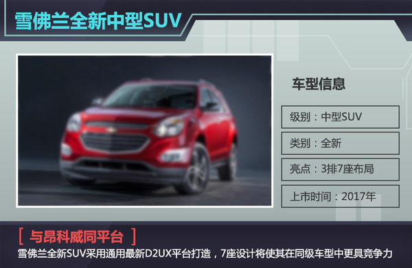 目前,雪佛兰在华仅推出创酷(小型)和科帕奇(中型)两款SUV。据悉,即将推出的全新7座SUV也是一款中型SUV,采用通用最新的D2UX中型车平台打造。相对于科帕奇的Theta平台,旨在生产高档SUV的D2UX平台容纳了更多先进技术,而未来通用旗下豪华品牌凯迪拉克XT5也将出自此平台。