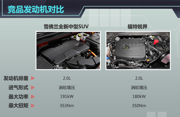 雪佛兰新款SUV发动机或与昂科威相同,采用通用旗下的Ecotec 2.0L涡轮增压发动机,其最大功率达190kW,最大扭矩353Nm,相比福特同为2.0L排量的EcoBoost发动机,在最大功率上高了10kW,如此强悍的功率输出在同级别车型中也难逢对手。变速箱方面,全新SUV或采用通用自主研发的DSS智能变速箱,而此变速箱同样用在昂科威上。