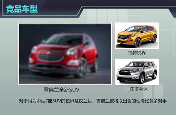 今年是雪佛兰品牌入华的第十个年头,一直以年轻、活力著称的雪佛兰品牌以其亲民的售价在家轿市场中创立了一片天地,但在SUV市场,雪佛兰的产品布局还不够全面。“中国目前已经是雪佛兰品牌全球第二大市场,仅次于美国市场。这些都说明雪佛兰品牌已经成功建立了全球化规模,也有了充分的技术储备。”通用全球雪佛兰品牌总裁贝亚伦(Alan Batey)表示。近日,网通社从海外媒体美国汽车新闻获悉:雪佛兰将于推出一款全新7座中型SUV产品,以竞争包括福特锐界在内的中型SUV产品。