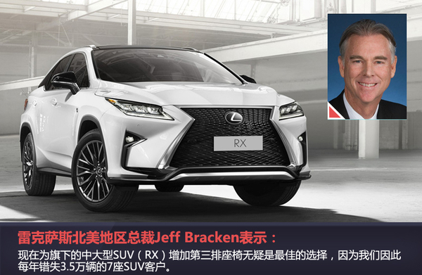 目前雷克萨斯旗下的主力车型RX有着每年10万辆以上的销售规模,但是其在中大型SUV市场上5座的布局还是难以满足一些客户的需求。雷克萨斯北美地区总裁Jeff Bracken此前在接受媒体采访时表示:“根据来自经销商的反馈消息,现在为旗下的中大型SUV增加第三排座椅无疑是最佳的选择,因为我们因此每年错失3.5万辆的7座SUV客户,尽管我们一直在努力。”Jeff Bracken接着说:“我们有很多套方案,这款雷克萨斯7座型跨界版SUV最快有望在2016年至2017年间正式上市,如果这项计划获批的话将处于优先研发的地位。”