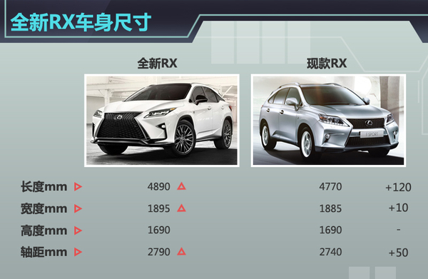 雷克萨斯全新RX车身尺寸得到升级,长度4890mm(加长120mm)、宽度1895mm(增加10mm),新车高度与现款RX相比保持不变,值得一提的是,全新RX轴距加长至2790mm,与现款车型相比增加50mm,使得新车的驾乘空间进一步增大。全新RX车身尺寸升级后在同级别车型中的竞争力得到大幅提升,其车身尺寸已与在售的现款宝马X5非常接近。同时全新RX车身尺寸的升级也为后续推出7座版本奠定了基础。