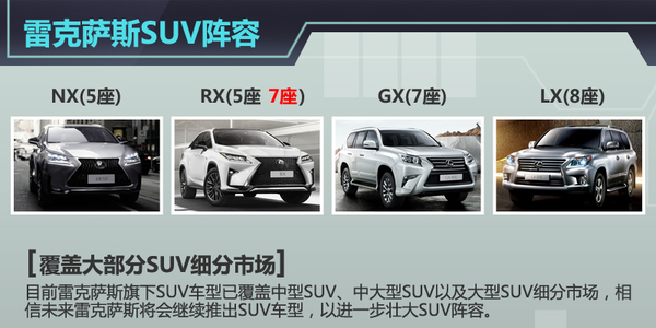 目前雷克萨斯旗下SUV阵容中包括中型SUV NX(5座)、中大型SUV RX(5座)、中大型SUV GX(7座)以及全尺寸SUV LX(8座),基本上实现了对SUV细分市场的全面覆盖,相信未来雷克萨斯将继续在SUV车型的推出方面发力,以实现对于SUV细分市场的全面覆盖,同时其品牌竞争力也可以得到大幅提升,并且消费者的选择也可以更为广泛。(网通社2015年7月23日北京报道)