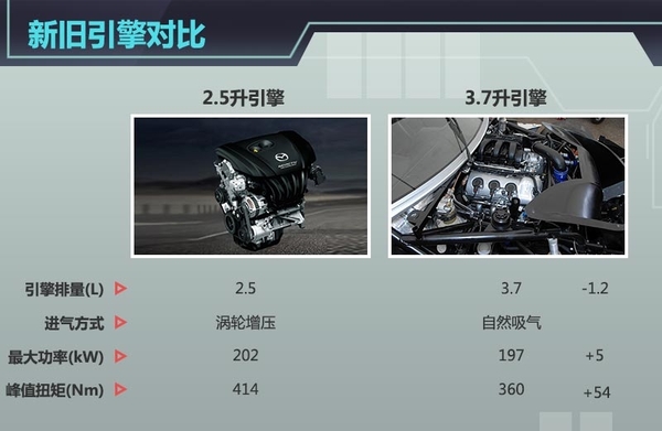 老款马自达CX-9基于福特CD3平台打造,搭载3.7T V6自然吸气发动机,采用S-VT可变气门正时控制系统,最大输出功率达到197kW,峰值扭矩为360Nm。新一代CX-9将基于马自达的创驰蓝天平台打造,搭载2.5升SKYACTIV-G型六缸涡轮增压引擎,最大输出功率超过202kW,首次实现了高压缩比(14.0),高压缩燃烧大幅提升了发动机工作效率和省油性,扭矩比过去提升了15%以上,有前驱和全驱配置供选配。