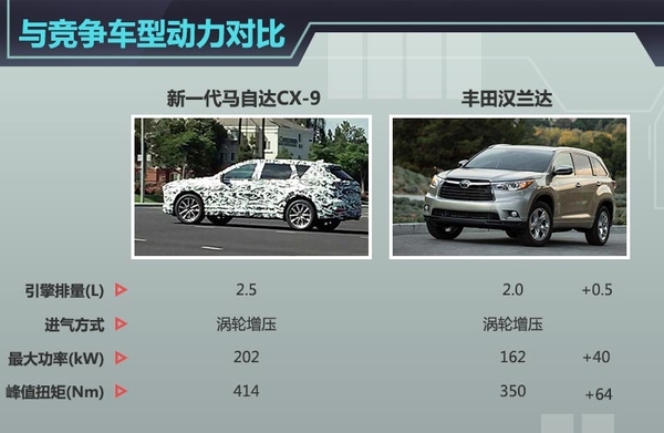 在国内全尺寸SUV阵营中,新一代马自达CX-9并不乏竞争对手,如丰田在中国便有其同级竞品车型。在动力方面,丰田汉兰达搭载了全新2.0T D-4ST双涡管涡轮增压发动机,其能根据发动机工况选择最佳的燃油喷射方式,最大输出功率为162kW,峰值扭矩可达350Nm。由此可见,CX-9在换搭SKYACTIV-G引擎后,动力参数比同级竞品车型更具优势。(网通社2015年7月22日北京报道)