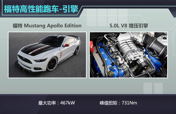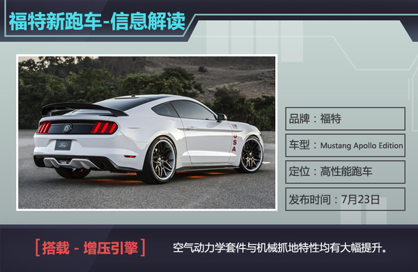 美国汽车制造商福特具有制造经济型轿车的丰富经验,但单一的产品线不足以在竞争激烈的汽车市场中站稳脚步,福特在意识到这一点后,便将基于“野马”车型推出全新高性能跑车。近日网通社从车迷世界Worldcarfans获悉,福特将基于标准版福特Mustang(野马)打造一款高性能版车型Mustang Apollo Edition,这款在动力及外形方面经过全新升级的跑车将于7月23日正式上市,且竞争雪佛兰高性能跑车Camaro SS。