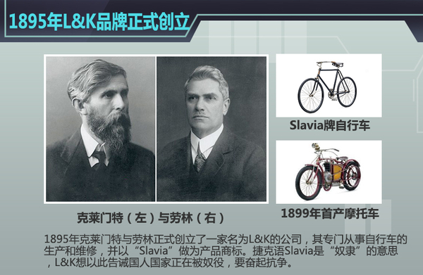 1895年圣诞周,克莱门特与机械师瓦茨拉夫•劳林(Václav Laurin,1865-1930)正式创立了一家自行车厂,这就是在当时十分出名的L&K公司。一开始L&K自行车厂只有7人,专门从事自行车的生产和维修,并以“Slavia”做为产品商标。捷克语Slavia是“奴隶”的意思,他们以如此激进的单词作为商标是因为1895年捷克处于战争阶段,在奥匈帝国的统治之下, L&K想以此告诫国人国家正在被奴役,要奋起抗争。