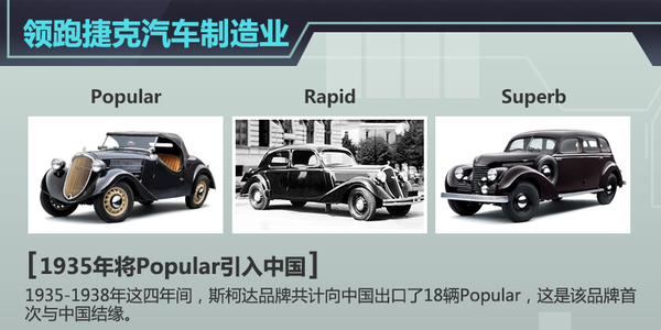 在20世纪30年代后期,斯柯达汽车凭借最热销的三个车型领跑当地的汽车制造业,这三个车型是:Popular/Rapid/Superb。值得注意的是,在就在这一阶段斯柯达于1935年正式开始向中国出口汽车,车型为Popular。在1935-1938年这四年间,斯柯达品牌共计向中国出口了18辆Popular,这是该品牌首次与中国结缘。