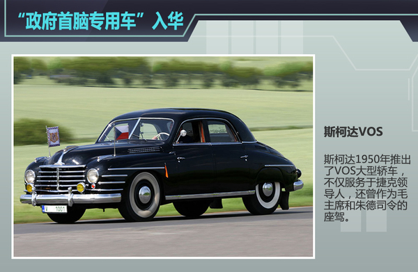 斯柯达在1950年推出了一款名为VOS的大型轿车。“VOS”在捷克语中意为“政府专用车”,在当时不仅服务于捷克领导人,还曾引入中国,作为毛主席和朱德司令的座驾。这款车总共生产了107辆,重量约为3.5-4.5吨,采用全面的装甲防护。