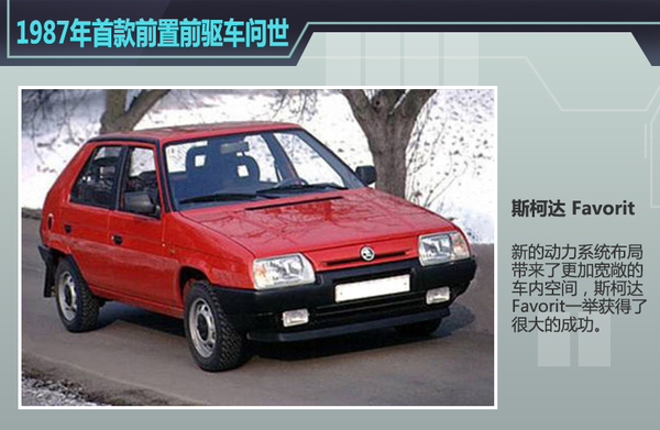 在后置发动机“盛行”了27年之后,斯柯达品牌于1987年推出了首款配备前置发动机的前轮驱动汽车Favorit。新的动力系统布局带来了更加宽敞的车内空间,斯柯达Favorit一举获得了很大的成功。