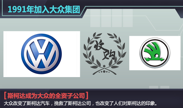 随着捷克经济体制的改变,1989年斯柯达又一次开始寻找强势的合作伙伴。1991年至2000年间,经过多次股权变更,斯柯达成为大众的全资子公司。从此,斯柯达借助大众的技术优势和管理经验,重树高品质和个性化形象,质量和市场推广方面得到长足进步,甚至成为世界畅销车。大众改变了斯柯达汽车,挽救了斯柯达公司,也改变了人们对斯柯达的印象。