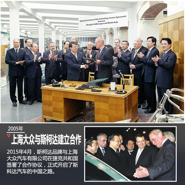 2005年2月,上海汽车集团股份有限公司、德国大众汽车公司、上海大众汽车有限公司和斯柯达汽车公司在捷克共和国姆拉达·博莱斯拉夫发表了关于建立上海大众和斯柯达战略合作关系的联合声明。在当时,中国总理温家宝先生与捷克总理帕劳贝克先生共同见证了这一时刻。两个月之后,斯柯达品牌与上海大众汽车有限公司在捷克共和国签署了合作协议,正式开启了斯科达汽车的中国之路。