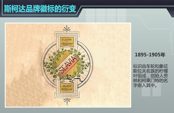 1895—1905:标识由车轮和象征斯拉夫名族的柠檬叶组成,创始人Laurin和Klement的名字镶嵌其中。这是斯柯达的前身L&K公司最早的LOGO。标识中有一个自行车轮,这是因为L&K公司那个时候是生产自行车的,(在欧洲国家,自行车在当时已经是先进交通工具了),而柠檬叶则是代表斯拉夫民族,车标上下部分分别嵌的是公司创始人劳林和柯莱门特( Laurin & Klement ) 的名字。这个车标带有明显的波希米亚风格,虽然复杂,但是确实漂亮。