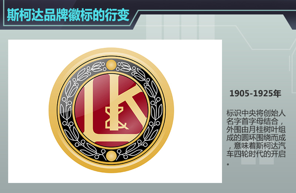 1905-1925:新标识中央将创始人姓名的英文首字母L和K加以结合,外围以古代时象征胜利的月挂树叶所组成的圆圈围绕而成。新标识的使用意味着斯柯达汽车终结了两轮时代的历史,大步迈向四轮时代。