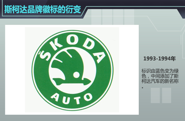 1993—1994:蓝色由绿色代替,中间添加了斯柯达汽车的新名称。