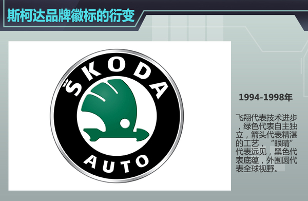 1994—1998:“飞翔之箭”在原基础上进行了改变,并被赋予了明确的内涵:飞翔代表技术的进步;绿色代表自主独立,亦表达了生产绿色产品的责任和义务;箭头代表精湛的工艺和生产方式;“眼睛”则表示远见和精确;黑色象征着斯柯达汽车百年的文化底蕴;外围的圆圈代表着全球化视野。